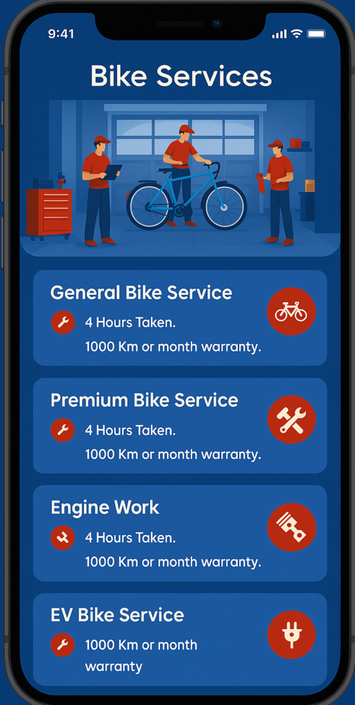 Bike Mechanic on Call – Get access to experienced and certified bike mechanics and electricians at your doorstep. Our professionals come equipped with the right tools, genuine spare parts, and quality engine oil — all at a pocket-friendly price.